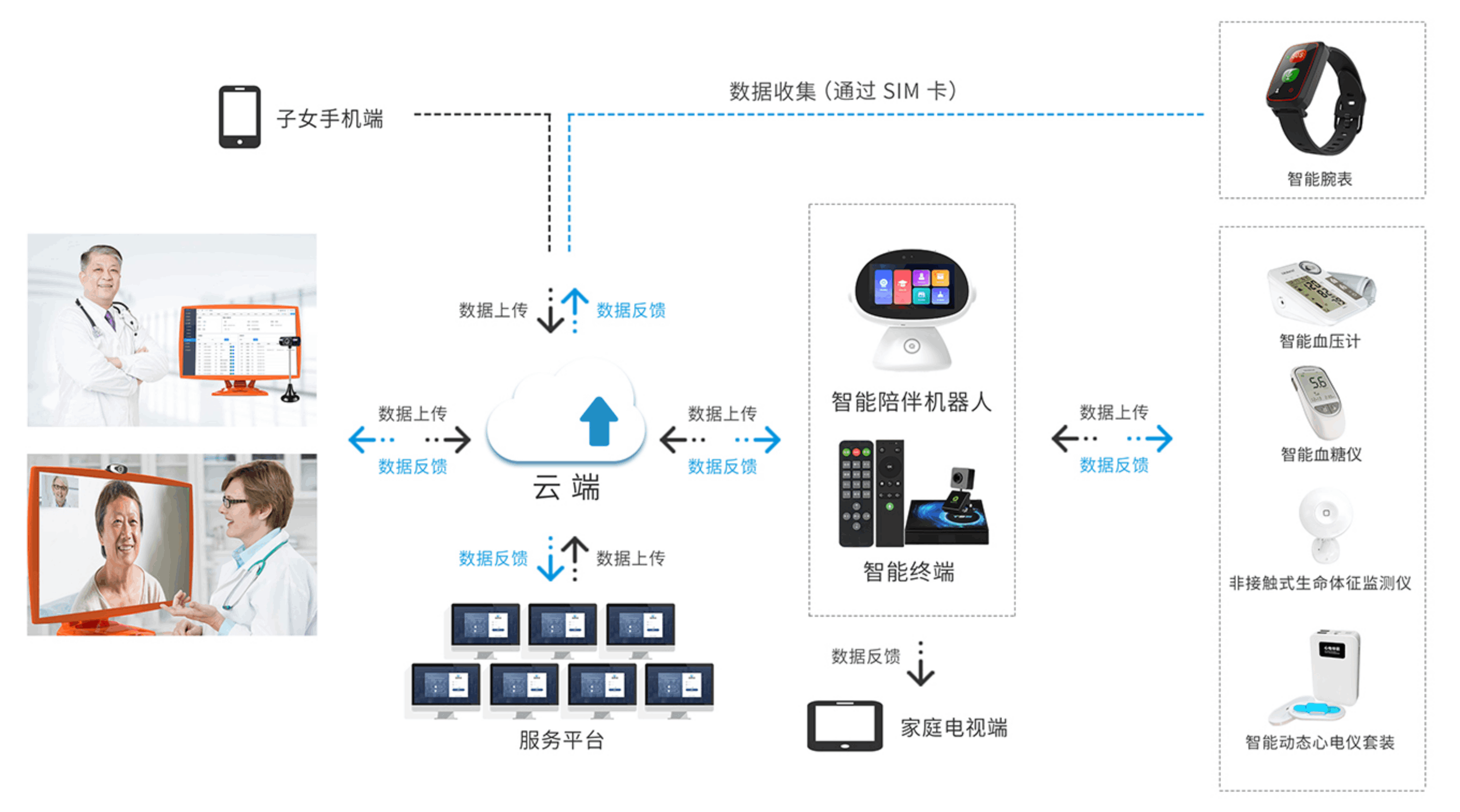 通過(guò)內(nèi)置GRPS模塊,利用無(wú)所不在的公共移動(dòng)通信網(wǎng)絡(luò),將數(shù)據(jù)直接上傳到云端。子女家屬手機(jī)綁定,老人日常使用方便,