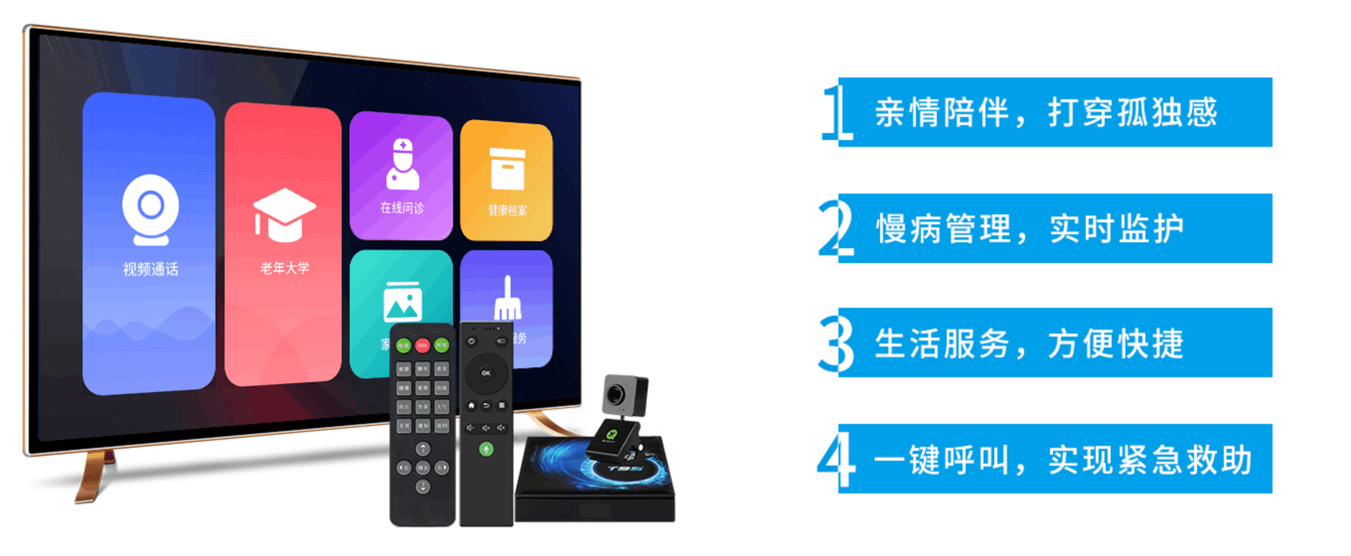 親情陪伴:老人可以通過(guò)遙控器與子女進(jìn)行視頻溝通,增加情感交流,促進(jìn)親情陪伴